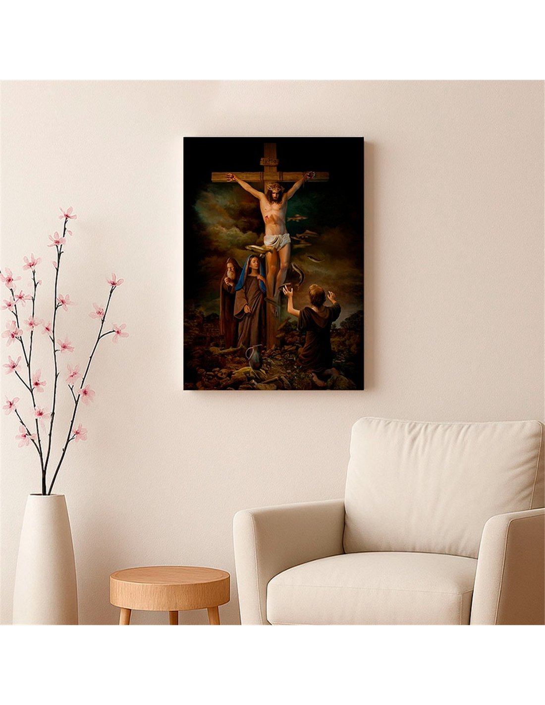 El Cuadro crucifixión 35x50cm lienzografía canvas Jesús de OSGESTUDIO es impreso en lienzo importado de alta calidad, tensado sobre bastidor de madera de 3 cm de espesor. Elaborado con impresión digital alta resolución, acabado semi brillante, textura artística y montaje listo para colgar. Ideal para decorar salas, estudios, oficinas, habitaciones y espacios con estilo clásico, elegante y artístico.