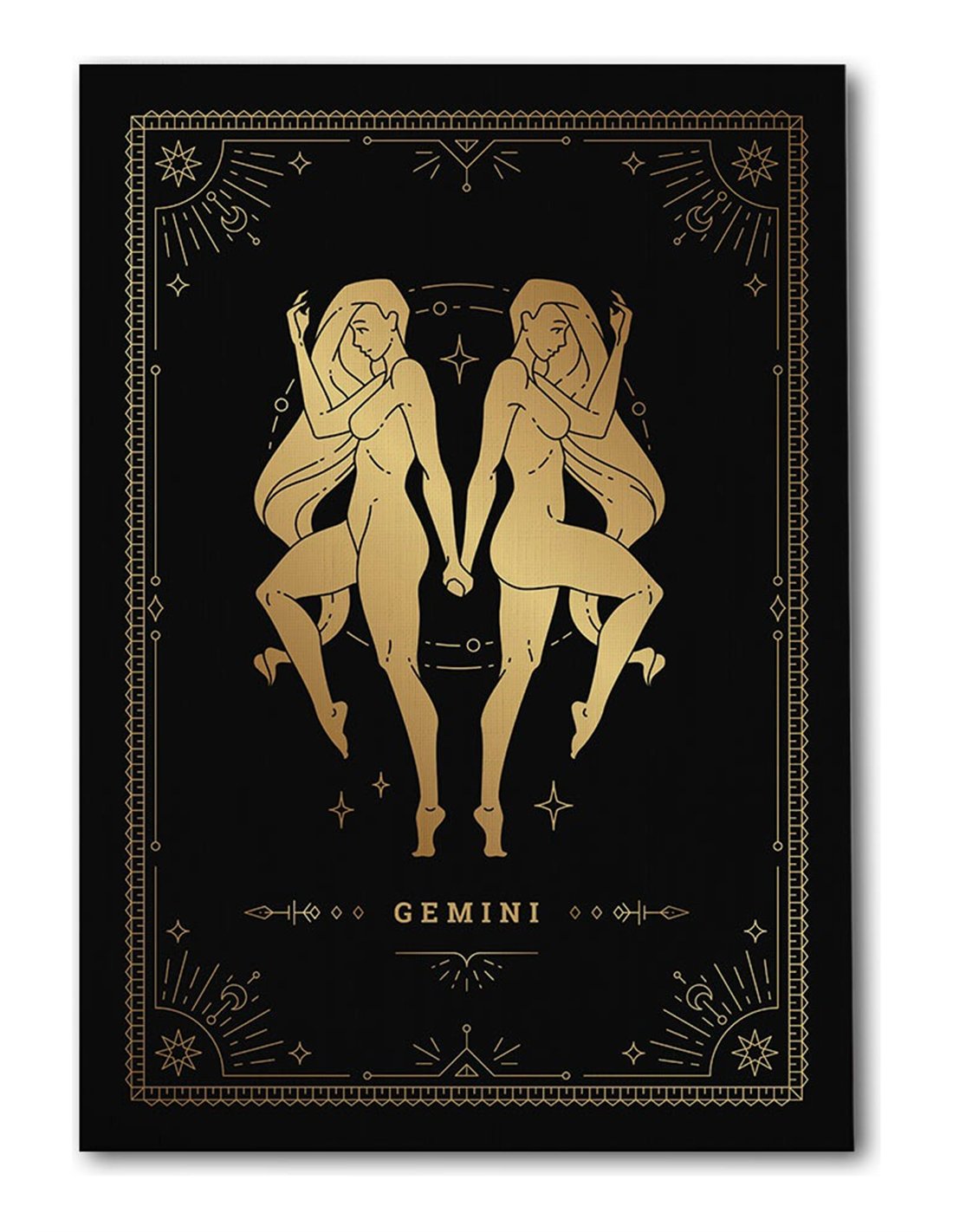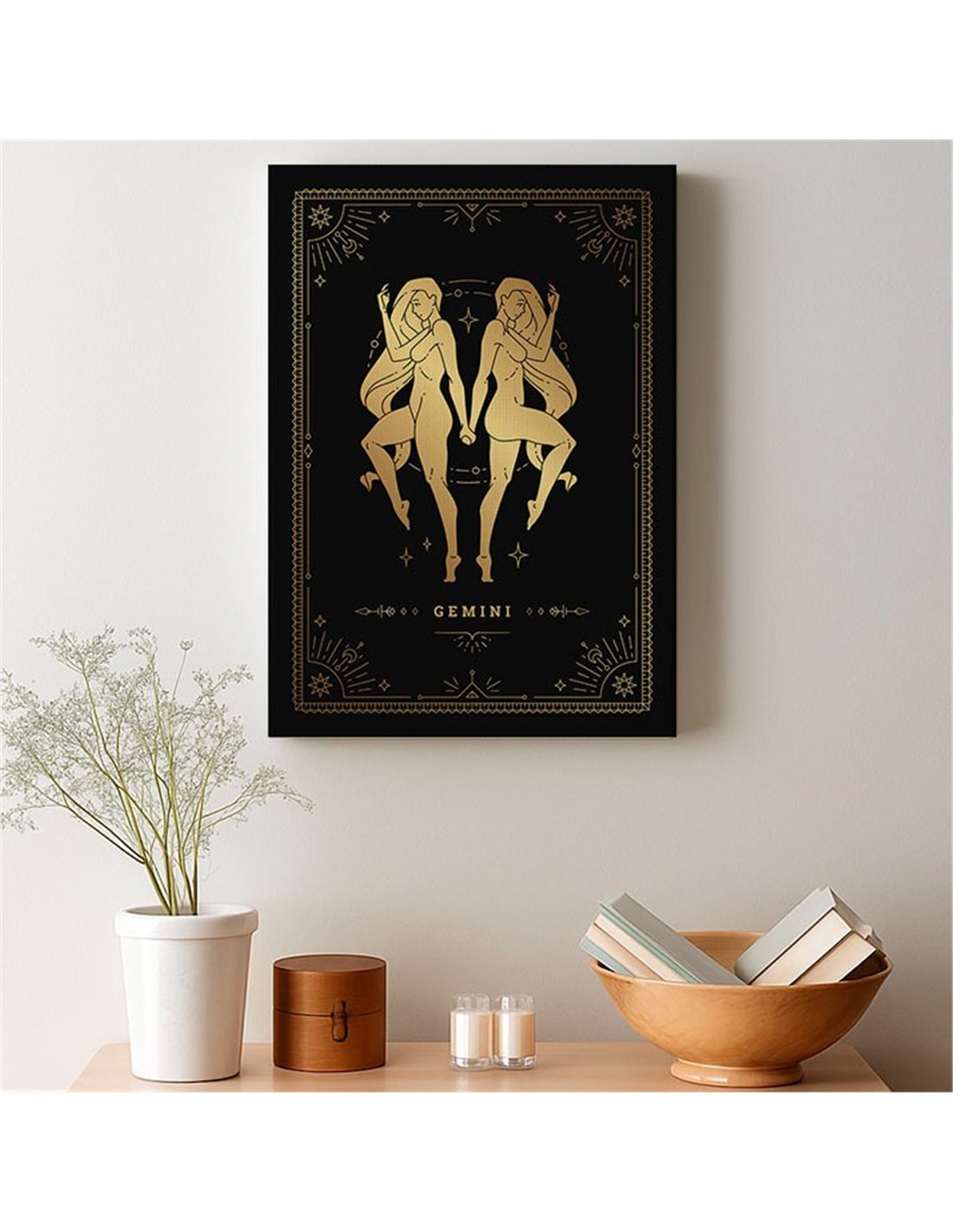El Cuadro Géminis 35x50cm lienzografía canvas dorado mágico de OSGESTUDIO es impreso en lienzo importado de alta calidad, tensado sobre bastidor de madera de 3 cm de espesor. Elaborado con impresión digital alta resolución, acabado semi brillante, textura artística y montaje listo para colgar. Ideal para decorar salas, estudios, oficinas, habitaciones y espacios con estilo clásico, elegante y artístico.