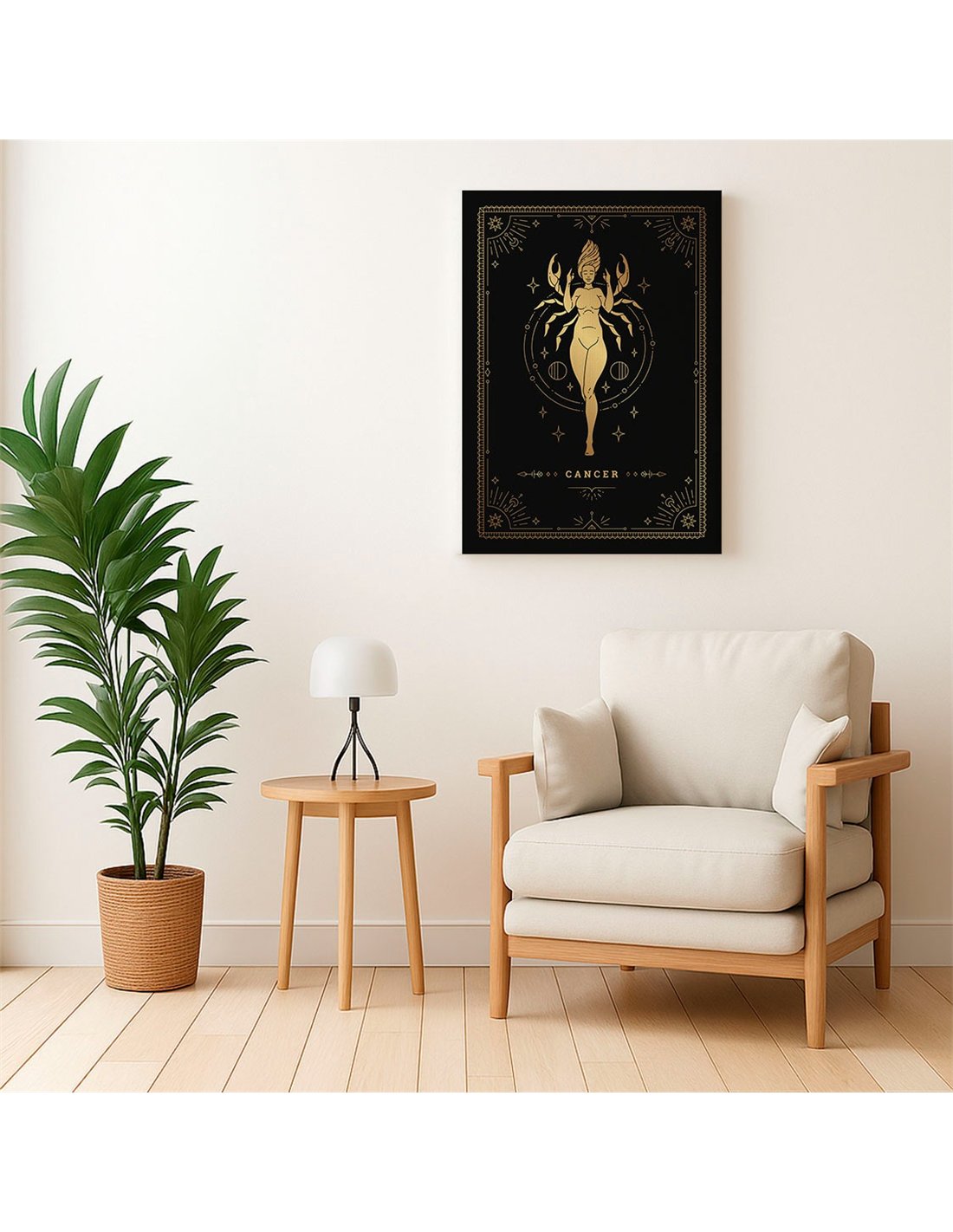 El Cuadro Cancer 35x50cm lienzografía canvas dorado mágico de OSGESTUDIO es impreso en lienzo importado de alta calidad, tensado sobre bastidor de madera de 3 cm de espesor. Elaborado con impresión digital alta resolución, acabado semi brillante, textura artística y montaje listo para colgar. Ideal para decorar salas, estudios, oficinas, habitaciones y espacios con estilo clásico, elegante y artístico.