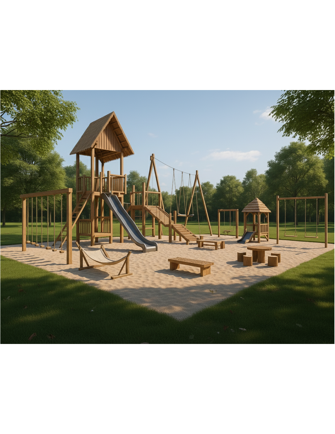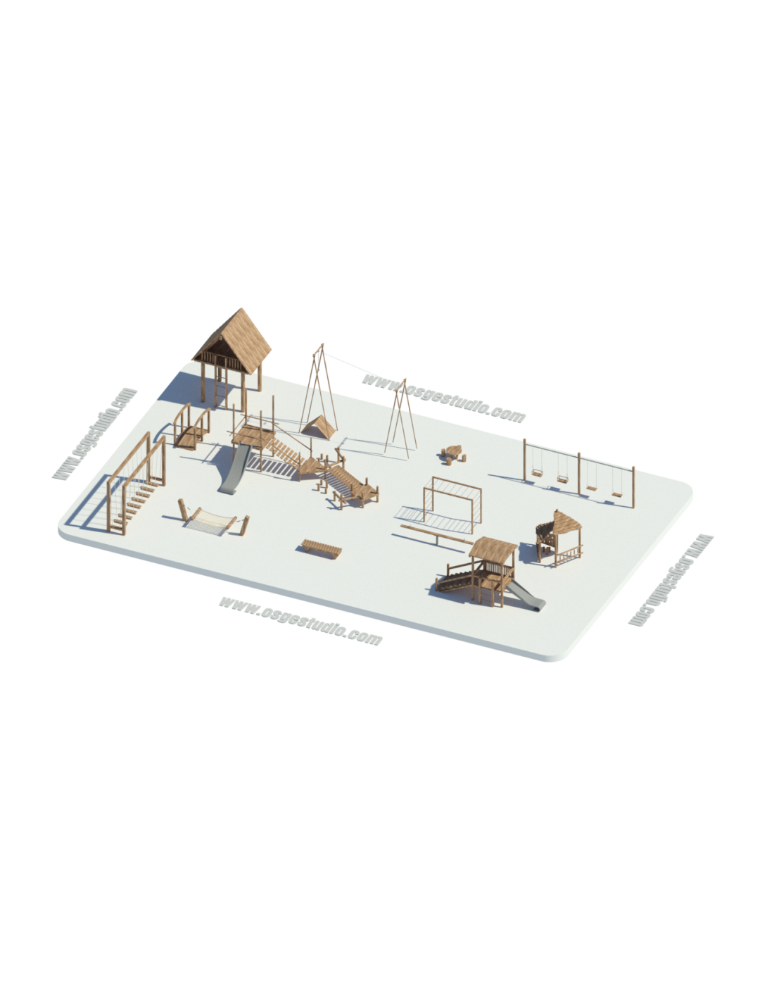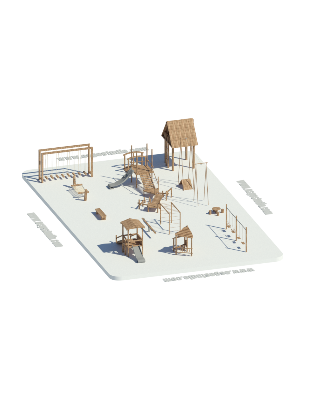 El paquete incluye estructuras típicas de zonas recreativas infantiles, como: