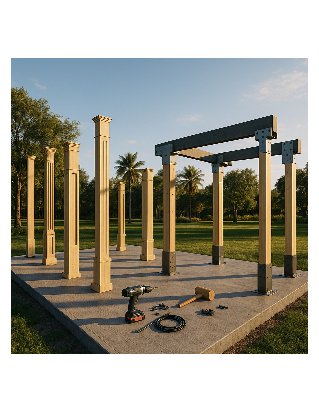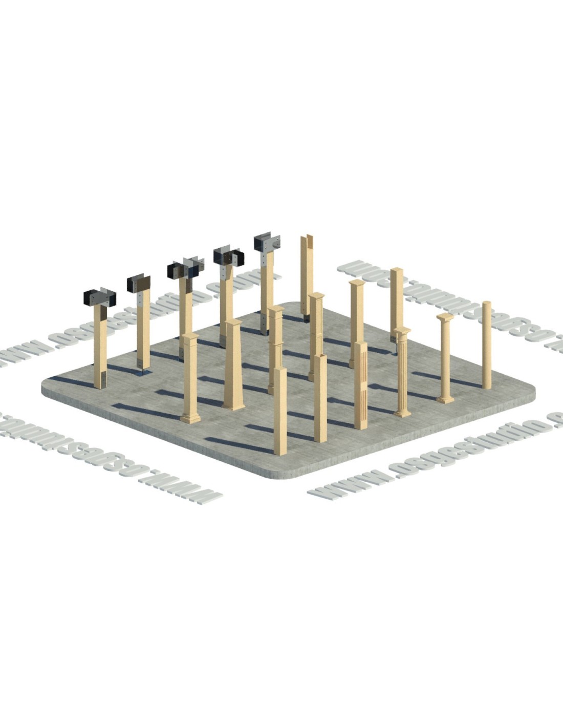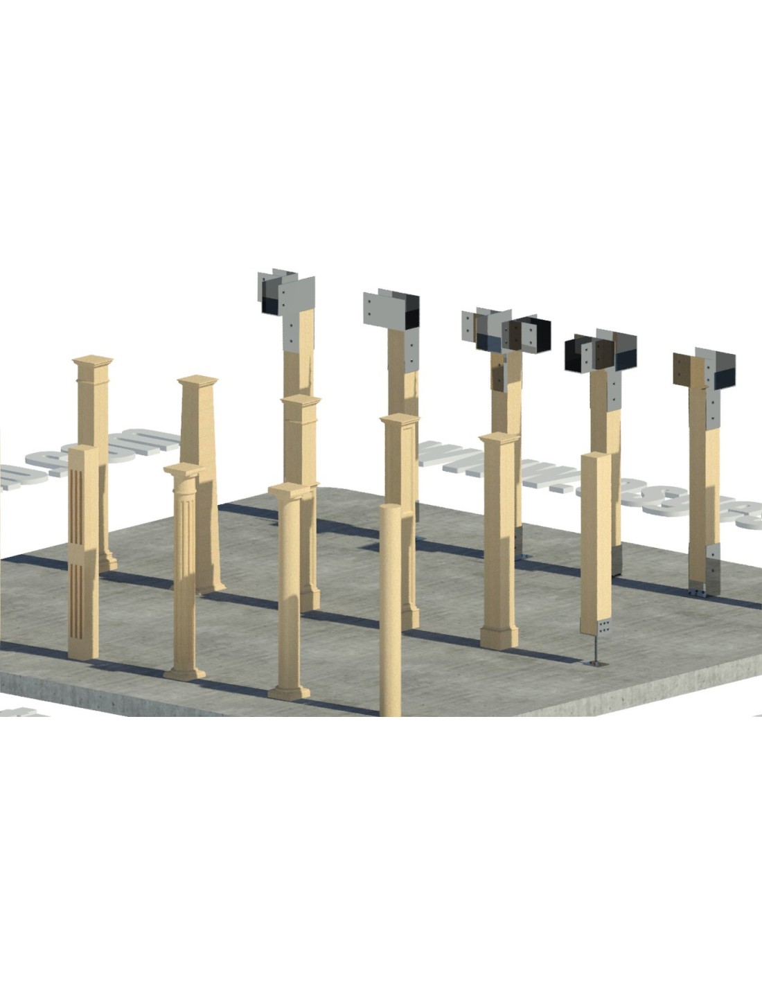Colección de columnas en madera con múltiples bases, capiteles y herrajes metálicos, creadas como modelos 3D para Revit (.rvt). Ideal para proyectos arquitectónicos, estructurales y de diseño exterior.